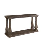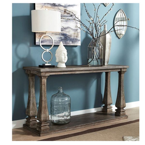 Hogareño. Abundante. Tono celestial. Con un atractivo acabado gris desgastado y patas de balaustre cuadradas colocadas en un amplio estante inferior para una gran presencia, la mesa de sofá Johnelle seguramente hará que su hogar se sienta mucho más como en casa. La apariencia está embellecida con chapas de olmo y una mesa enmarcada y con efecto de tabla para una obra maestra ricamente elaborada hecha para años de satisfacción.