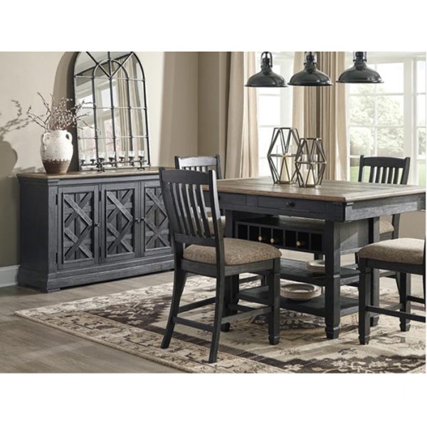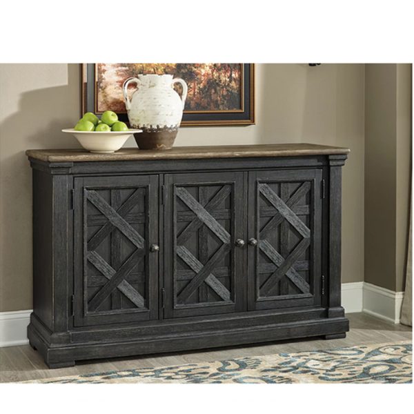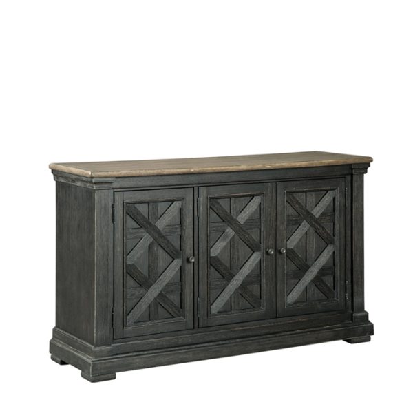 Invita a tu familia al corazón de tu hogar con este servidor de comedor. El acabado negro tiene una textura hermosa. La parte superior de roble planchado de Timeworn crea un contraste único de dos tonos. El encantador diseño de celosía adorna el frente de las puertas. Guarde lo esencial en la estantería del gabinete. Pilastras gruesas se suman a la robustez de los cimientos. Este es el estilo de casa de campo urbano de tendencia correcta.