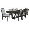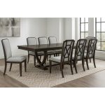Mesa comedor. Enchapada en cerezo y barnizada en nogal oscuro que realza su fina terminación. Posee 2 extensiones centrales de 35 cms. Con base de madera cruzada que la define en su estilo moderno.