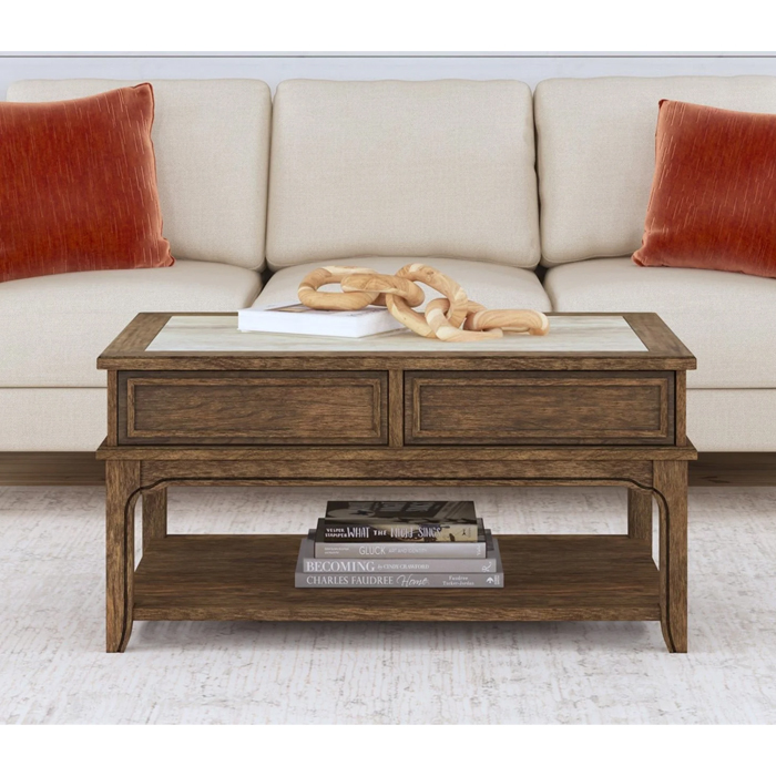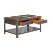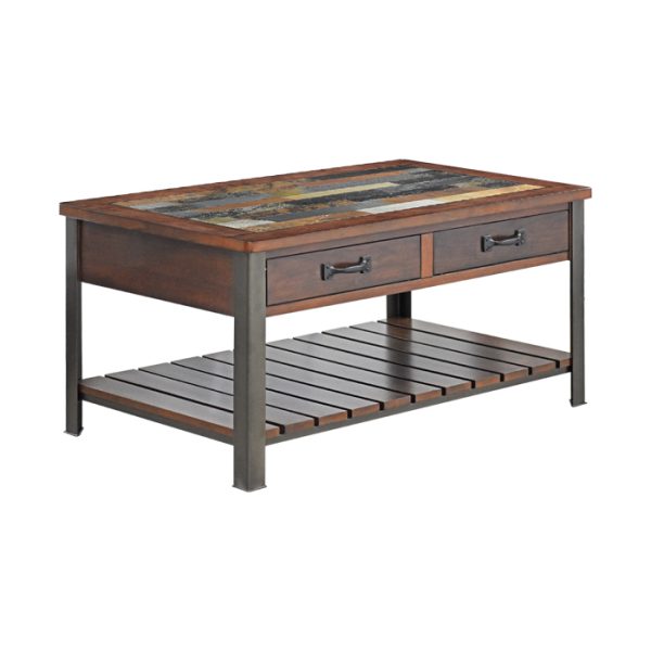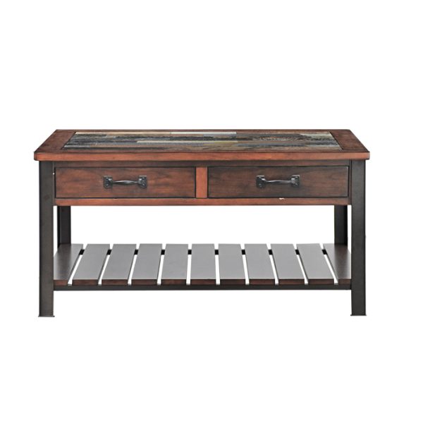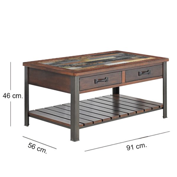 Mesa de Centro Loft Wood de estilo rústico industrial. Dale a tu sala un toque sofisticado y funcional con esta mesa de centro que combina la calidez de la madera con la fuerza del metal. Su diseño incluye: Cubierta con acabado tipo piedra que aporta textura y carácter único. Estructura robusta en madera tono cálido y patas metálicas en color negro para un look industrial moderno. Dos prácticos cajones con tiradores metálicos, ideales para mantener el orden. Repisa inferior tipo rejilla, perfecta para organizar libros, revistas o elementos decorativos. Ideal para espacios contemporáneos, rústicos o industriales, esta mesa no solo es un complemento decorativo, sino también una solución práctica para tu hogar.