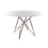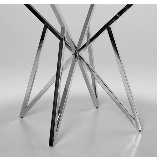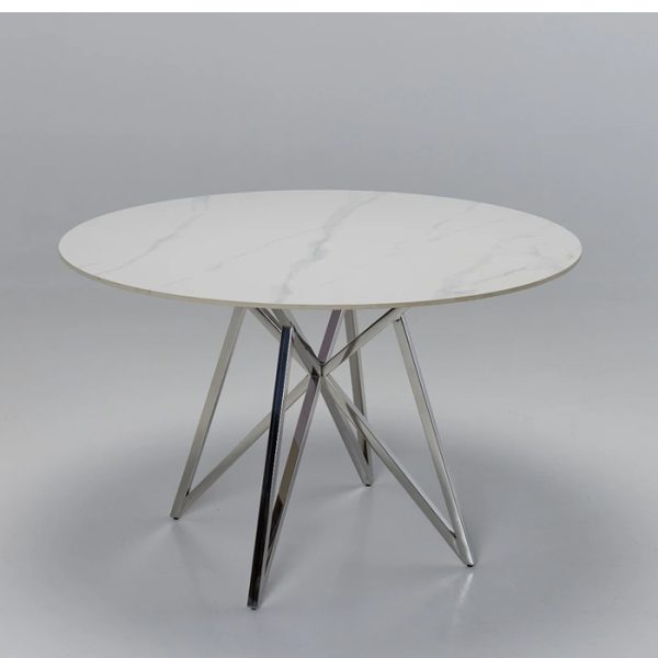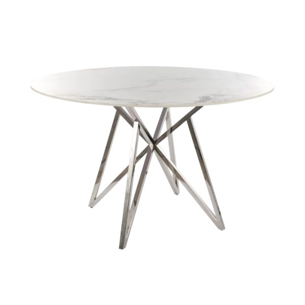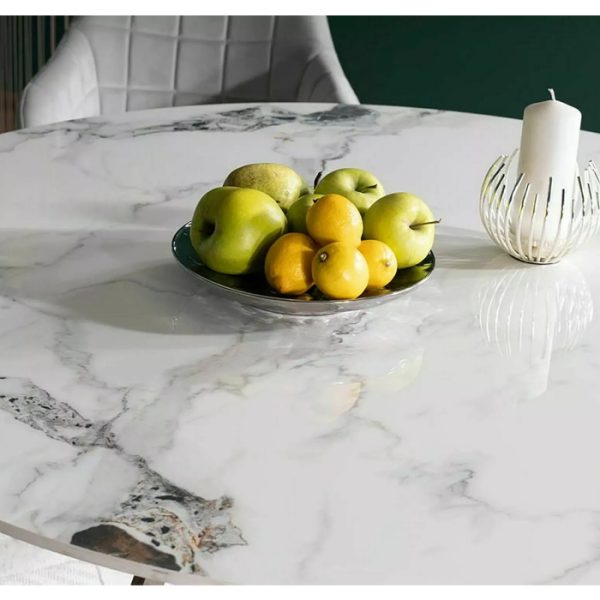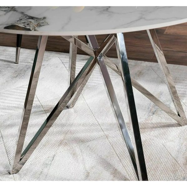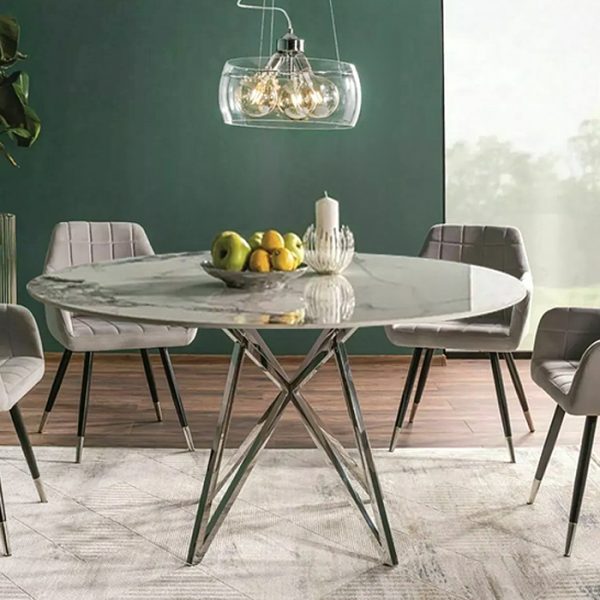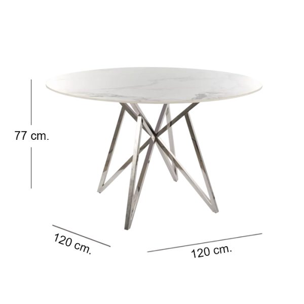 Mesa de comedor circular Lifecas cromada. La excepcional mesa de comedor redonda con originales metálicas cromadas aportará a su comedor no solo un diseño elegante , sino también practicidad y durabilidad . La mesa de comedor circular Lifecas con efecto mármol blanco que irradia elegancia natural con vetas grises añade un toque sofisticado a su interior y se convierte en el centro de atención. La mesa se apoya sobre patas metálicas en forma de estrella de alta calidad , lo que garantiza su estabilidad y resistencia. El material con el que está fabricada no solo es de alta calidad, sino también duradero y fácil de mantener.