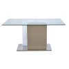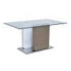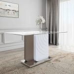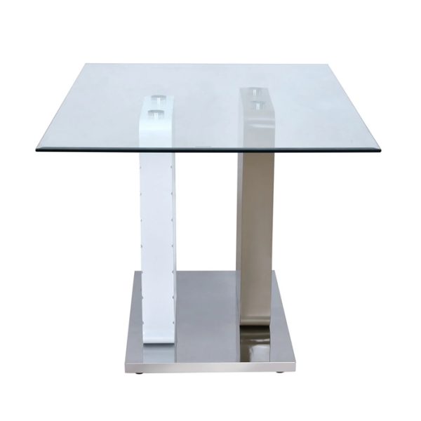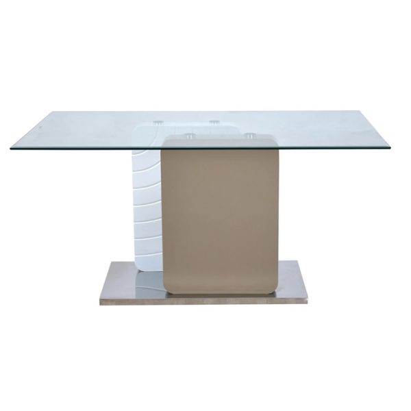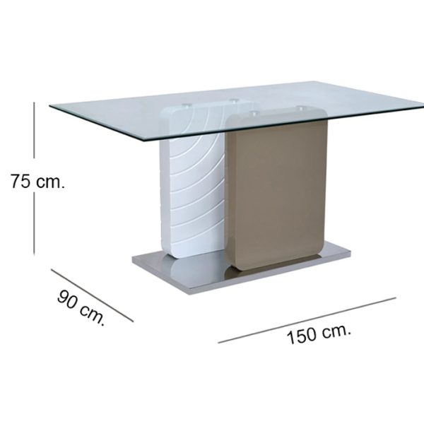 Realza tu experiencia gastronómica con la mesa de comedor Coffe White Lifecas, una fusión perfecta de diseño y funcionalidad. La mesa cuenta con una superficie de cristal transparente con bordes biselados, que irradia sofisticación y garantiza una durabilidad excepcional. Su pedestal bicolor, con bordes suaves y curvas y un diseño concéntrico, se apoya sobre una base de madera de ingeniería con acabado brillante, que le confiere un encanto contemporáneo. Una placa base de acero inoxidable aporta una estabilidad superior y complementa su lujoso diseño. Esta mesa combina a la perfección la estética moderna con una sólida construcción, convirtiéndose en una pieza central impactante para tu comedor.
