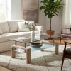 Mesa de centro de estilo moderno, de estructura MDF con finish foil madera y cubierta de 8mm. de vidrio templado transparente.
