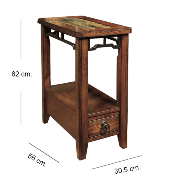 Realce su espacio vital con el encanto atemporal de la mesa lateral Rustic OAK de madera y pizarra. Combinando estilos rústicos y tradicionales, esta pieza presenta una superficie de pizarra con borde metálico, complementada con herrajes con acabado de bronce estatutario. El borde metálico decorativo añade un elemento de diseño único, creando un mueble visualmente atractivo. Fabricada con madera maciza, chapa de roble y metal, esta mesa lateral garantiza durabilidad gracias a su construcción en madera secada al horno. Con un cajón y un estante inferior, ofrece amplio espacio de almacenamiento y exhibición para los artículos esenciales y la decoración de su sala de estar.