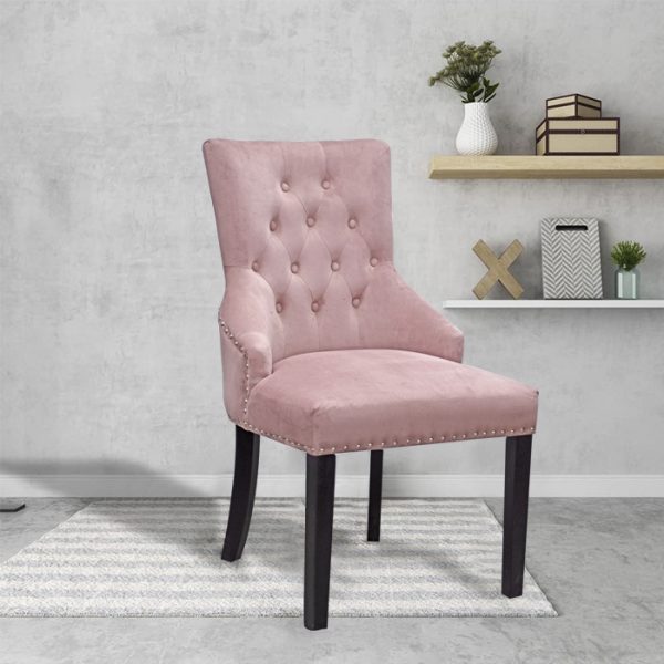 Las sillas Capitone Pink de comedor modernas tienen un diseño de ala curva con reposabrazos y elegantes clavos plateados alrededor con tela de botón de diamante para añadir una sensación de elegancia. De respaldo alto ligeramente curvadas están diseñadas ergonómicamente para adaptarse a la forma de su cuerpo, protegiendo eficazmente su cintura y espalda y aliviando la fatiga de estar sentado durante mucho tiempo. El marco de madera maciza y las patas y cabezas de clavos negras en un color plateado brillante combinarán con la decoración interior clásica. Diseño resistente de plástico para proteger tu suelo de arañazos. Silla ideal para comedor y restaurante, cocina, sillas laterales para sala de estar, dormitorio, vestidores, sillones de recepción.