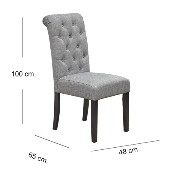 Silla Tapizada Gris Capitoné Drag. Alto y ligeramente curvado hacia atrás. Detalle capitoné con botones que crean un patrón acolchado tipo rombo. Estilo clásico reinterpretado con un enfoque moderno. Tapizado Tela gris texturizada de acabado fino. Apariencia sobria y versátil, ideal para entornos contemporáneos o minimalistas. Asiento Amplio y bien acolchado, proporcionando confort para usos prolongados. Bordes bien definidos, con costuras discretas que aportan limpieza visual. Diseño robusto y estable.